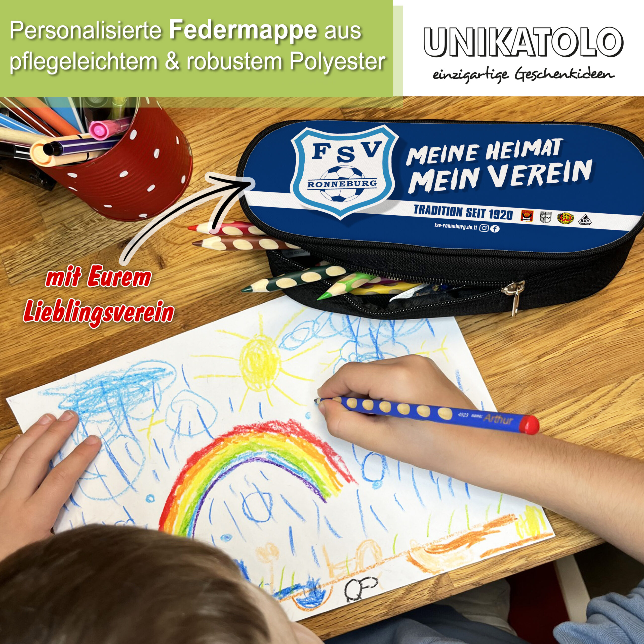 Die personalisierte Federmappe vom FSV Ronneburg ist das perfekte Geschenk für alle Vereinsmitglieder und Schulkinder – und auch praktisch als kleine Kosmetiktasche für unterwegs! Ob Stifte, Bastel- oder Zeichenutensilien, in diesem Reißverschluss-Etui lassen sich alle wichtigen Kleinigkeiten ordentlich verstauen und überallhin mitnehmen.