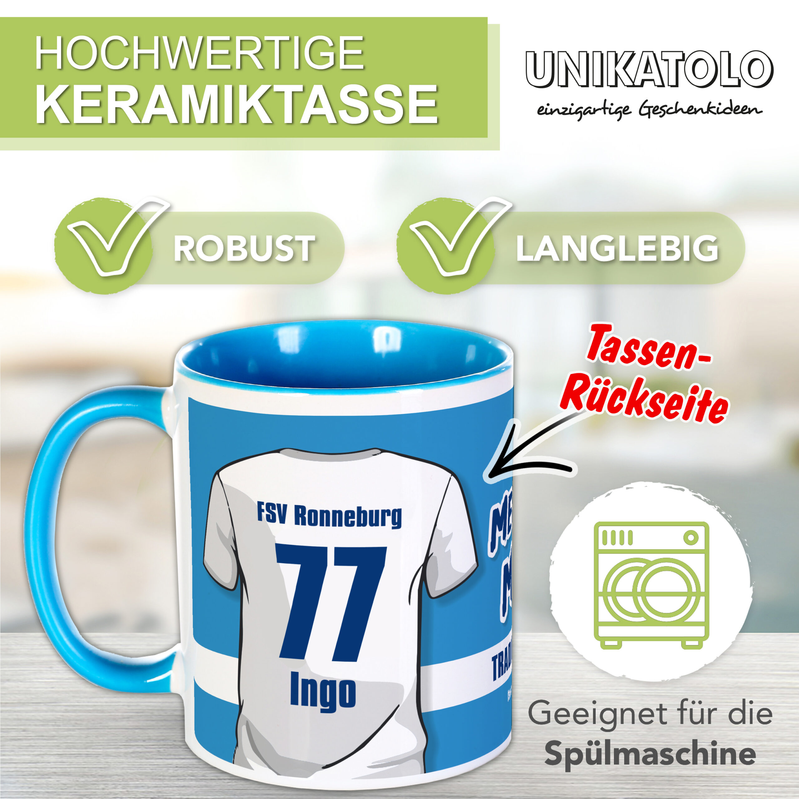Sucht ihr nach einem originellen und einzigartigen Geschenk für ein Vereinsmitglied oder einen Vereinsfan? Unsere personalisierte Tasse mit dem Vereinslogo vom FSV Ronneburg ist die perfekte Lösung! Verschenkt die personalisierte Tasse und es wird garantiert die neue Lieblingstasse des Beschenkten. Es eignet sich als Vereinsgeschenk zum Wichteln oder als Geburtstagsgeschenk. Sie ist nicht nur für Erwachsene, sondern auch für Kinder bestens geeignet.