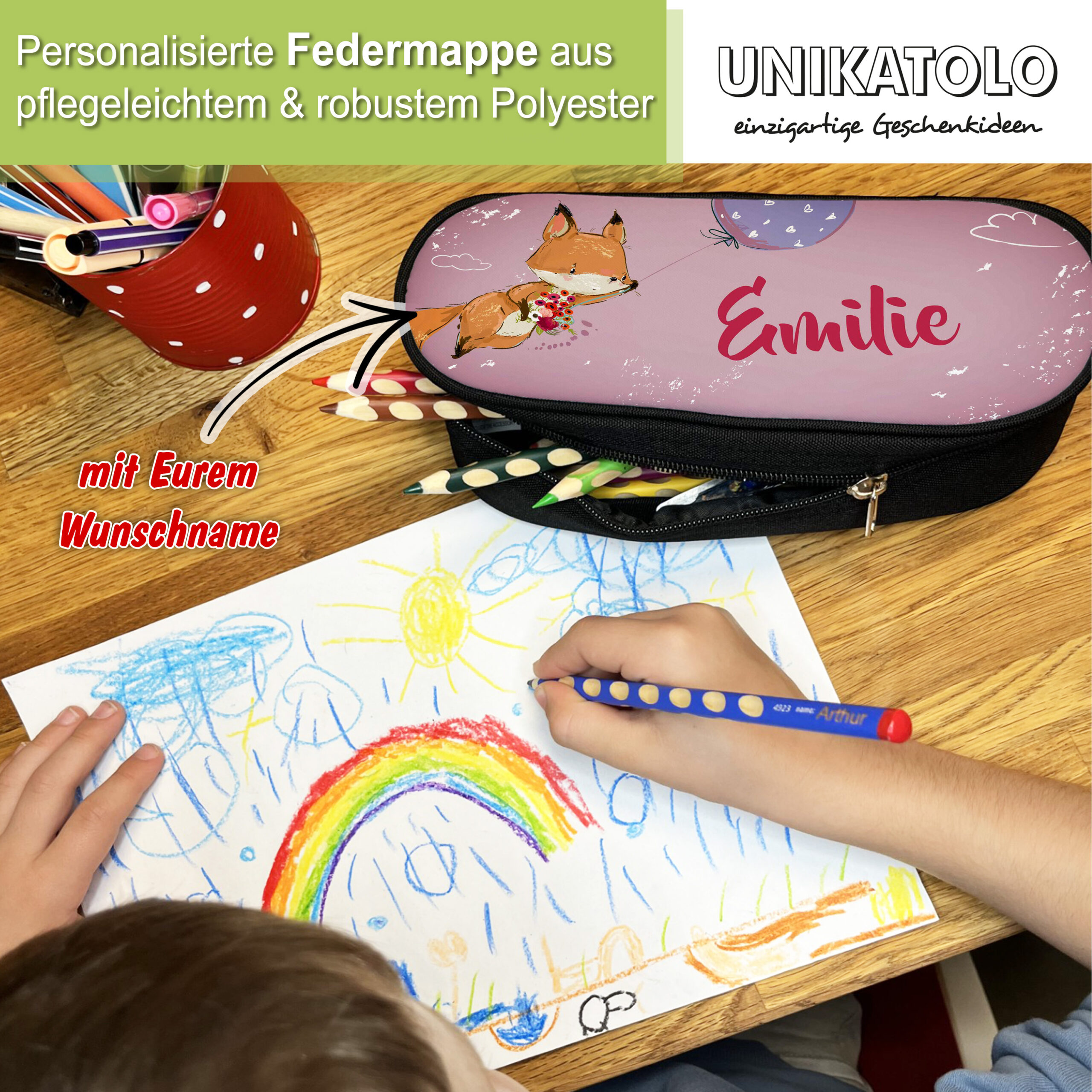 Das personalisierte Federmäppchen ist ein wunderbares Geschenk, das Freude bereitet und zugleich praktisch ist. Verschenkt es zum Geburtstag, zur Einschulung, zu Weihnachten oder einfach nur so als nettes Mitbringsel.