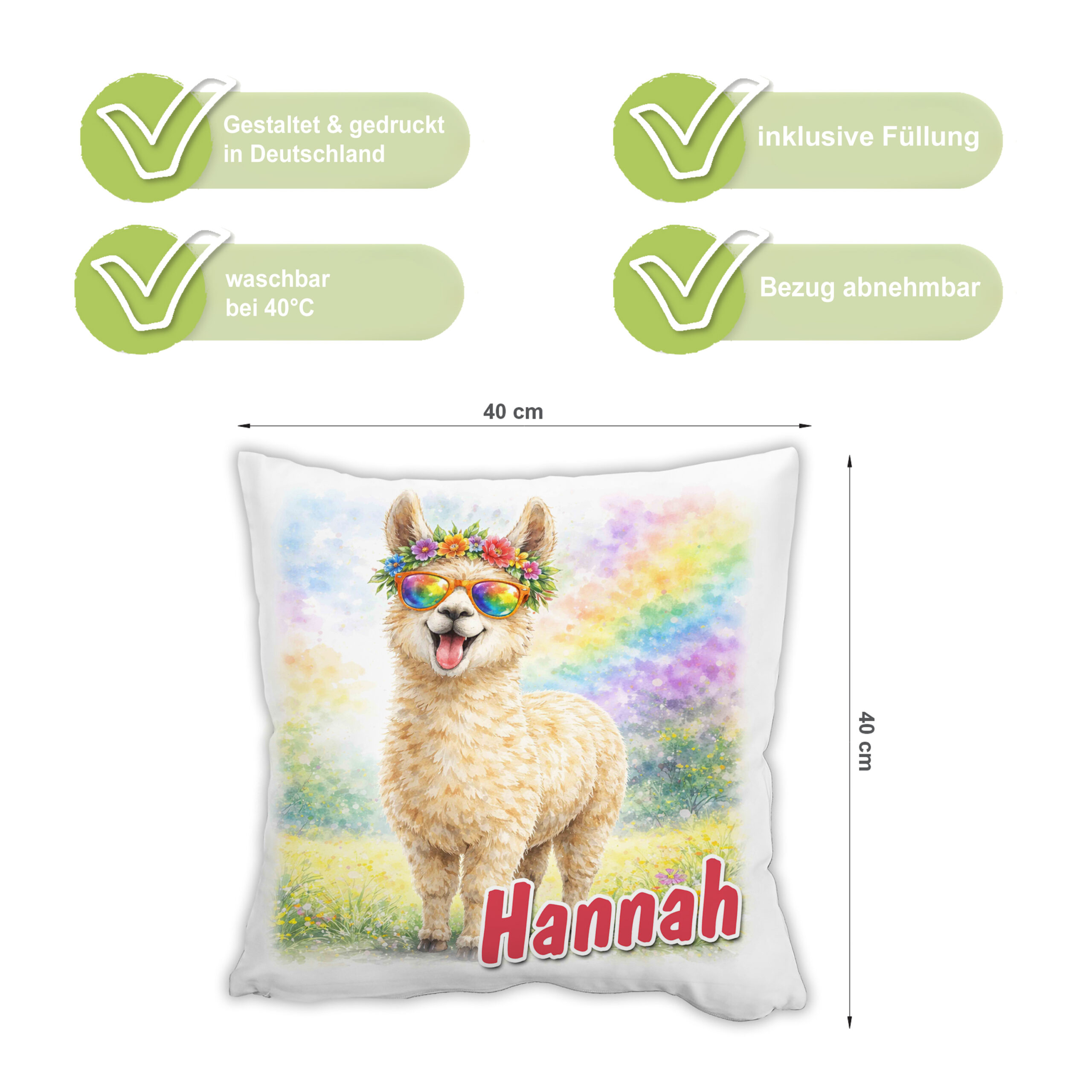 Das niedliche Alpaka in Kombination mit dem Wunschnamen macht jedes Kissen zu einem Unikat, das Kinder und Eltern gleichermaßen begeistert. Ob zum Geburtstag, zu Ostern, Weihnachten oder einfach als kleine Aufmerksamkeit – dieses Kissen sorgt garantiert für Freude.