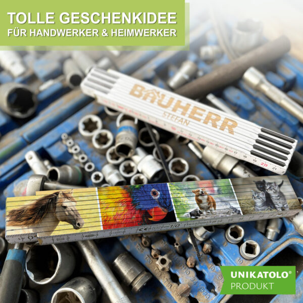 INDIVIDUELL: Mit unserem Gestaltungstool kannst du ganz einfach deinen eigenen Zollstock entwerfen. Wir fertigen anschließend deinen personalisierten Gliedermaßstab genau nach deinen Wünschen. Diese Geschenkidee eignet sich hervorragend zum Geburtstag, Einzug ins neue Zuhause, Richtfest oder auch zum Schulanfang. Durch die individuelle Gestaltung wird ein alltägliches Werkzeug zu einem Erinnerungsstück mit persönlichem Wert.
